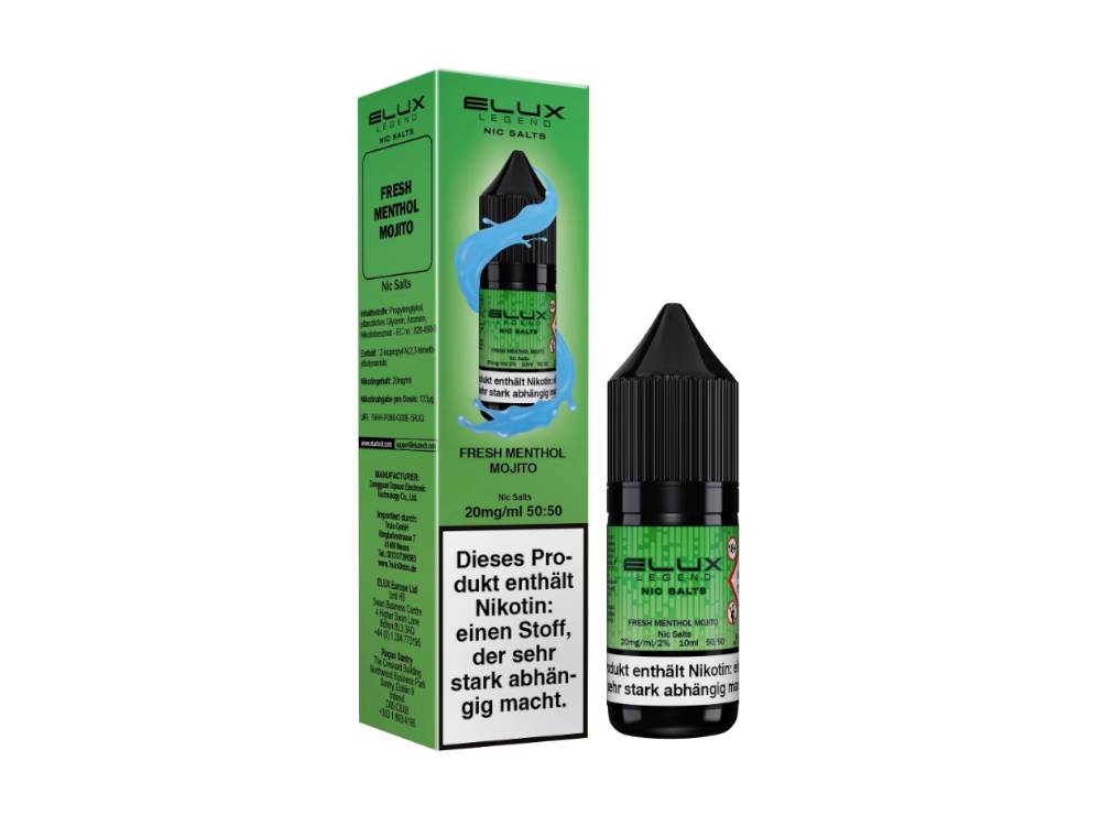 Das Nikotinsalz Liquid Fresh Menthol Mojito von Elux kombiniert eine spezifische Geschmacksrichtung mit Nikotinsalz-Technologie. Das Produkt ist für die Verwendung in geeigneten E-Zigaretten konzipiert.