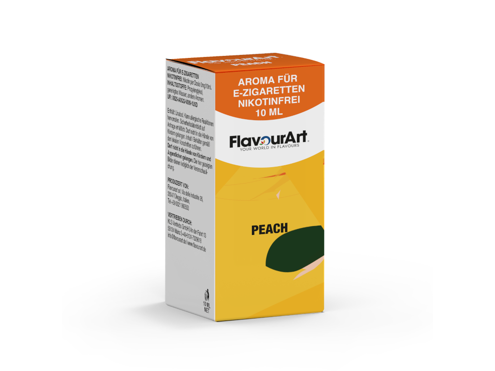Das FlavourArt Aroma Peach dient als Konzentrat zur Herstellung individueller E-Liquids. Das 10 ml Gebinde enthält ein Aromakonzentrat, das vor der Verwendung mit einer Basisflüssigkeit gemischt werden muss.