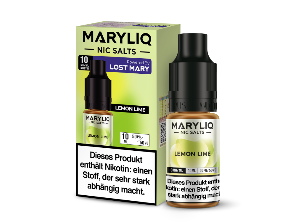 Das MARYLIQ Nikotinsalz Liquid in der Sorte Lemon Lime kombiniert Zitronen- und Limettenaromen. Es handelt sich um ein gebrauchsfertiges Nikotinsalz-Liquid, das in zwei Nikotinstärken erhältlich ist.
