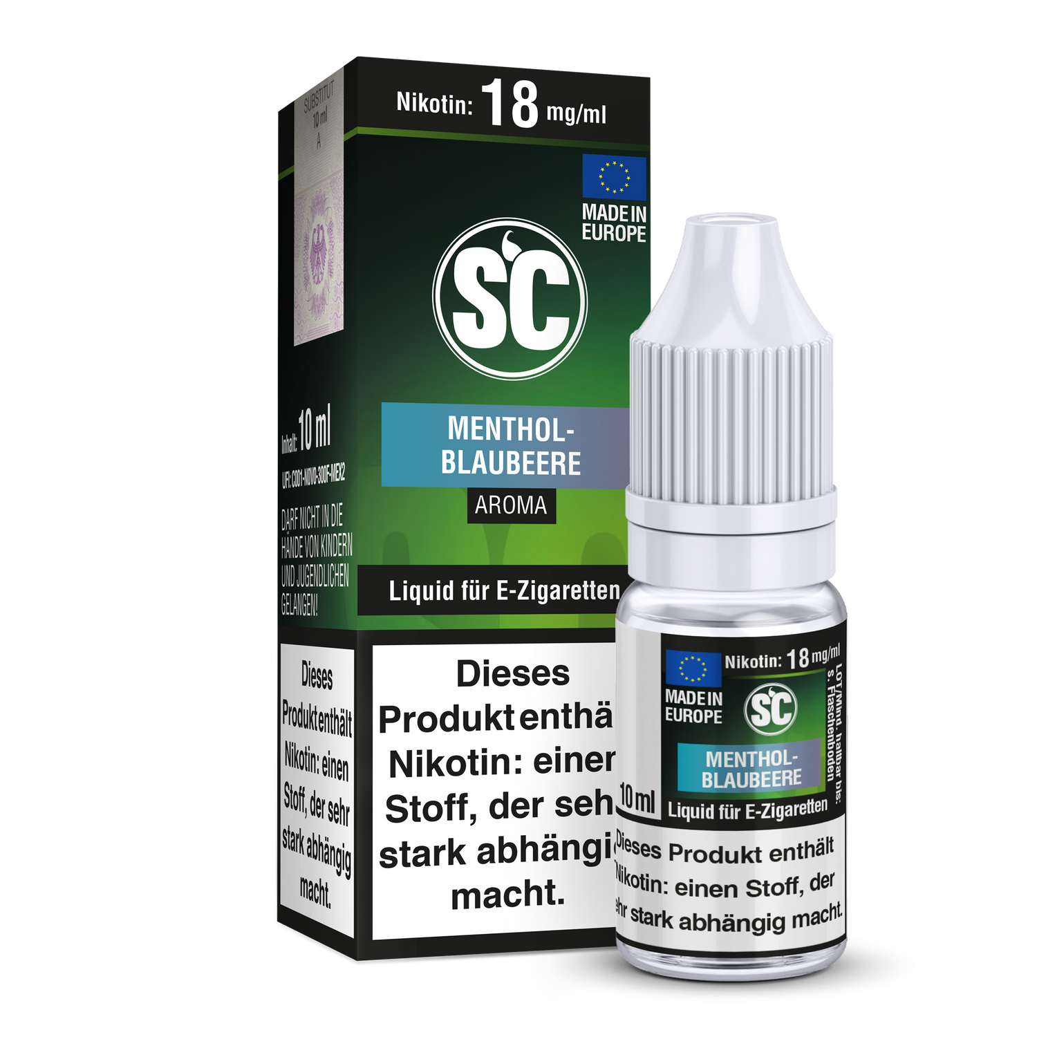 Das SC Menthol-Blaubeere E-Zigaretten Liquid kombiniert die Geschmacksrichtungen Menthol und Blaubeere. Die Basis des Liquids besteht aus Propylenglycol, pflanzlichem Glycerin und demineralisiertem Wasser.