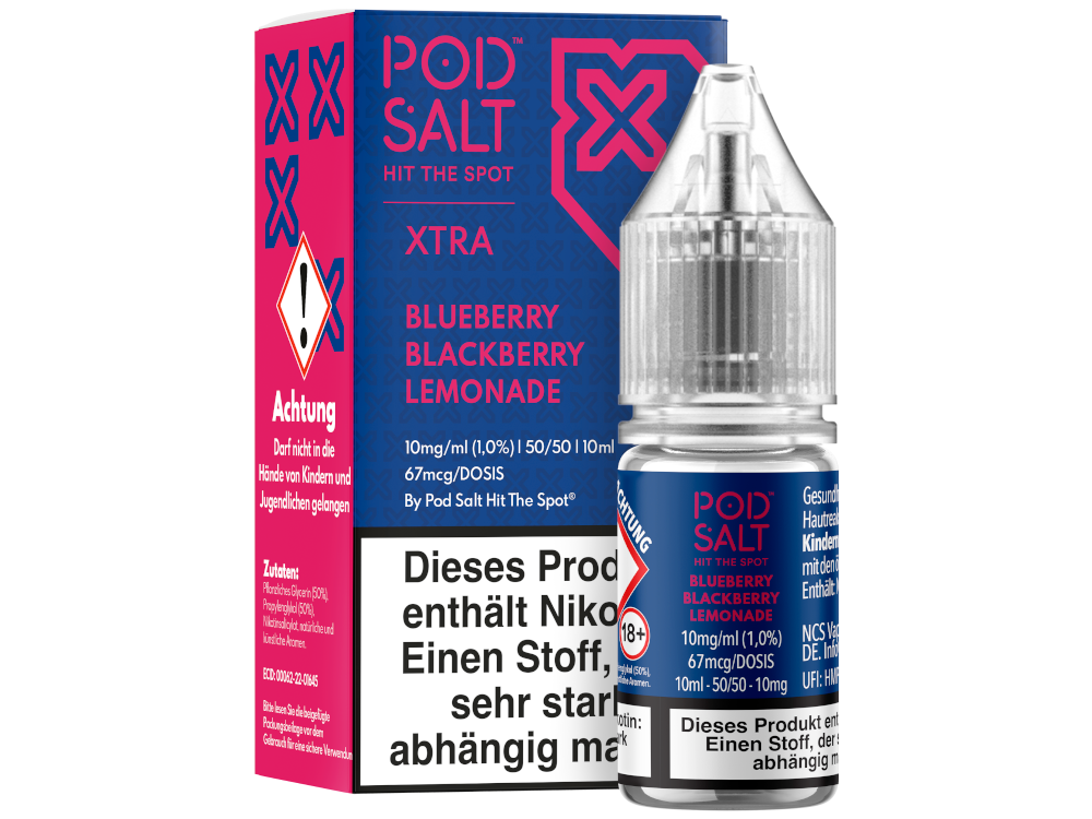 Das Pod Salt X Nikotinsalz Liquid in der Geschmacksrichtung Blueberry Blackberry Lemonade ist eine Zubereitung für E-Zigaretten. Die Rezeptur kombiniert Inhaltsstoffe zu einer fertig gemischten Flüssigkeit.