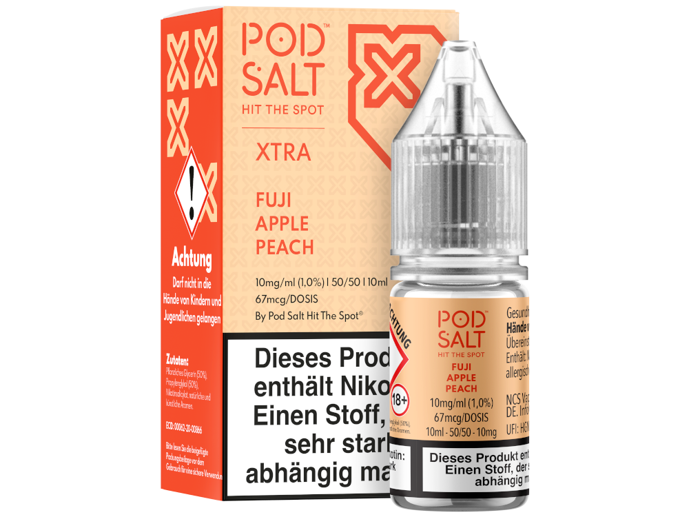 Das Pod Salt X Nikotinsalz Liquid Fuji Apple Peach ist in den Stärken 10 mg/ml und 20 mg/ml erhältlich.