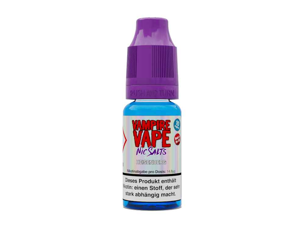 Das Vampire Vape Heisenberg Nikotinsalz Liquid ist für Pod-Systeme und E-Zigaretten mit niedriger Leistung und einem Widerstand über 1.0 Ohm ausgelegt.